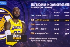 转播方晒出系列赛终结战胜率,在至少打过25场比赛的球员里,詹姆斯41胜13负,胜率75.9%,仅次于费舍尔。