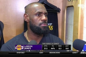 24直播网4月27日讯 今日,湖人96-115客场不敌火箭,系列赛3-1领先。赛后,湖人球星詹姆斯接受了采访。