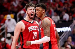 24直播网4月27日讯 火箭今日主场以115-96击败湖人,将系列赛比分扳至1-3。赛后,火箭球员小贾巴里接受媒体采访。