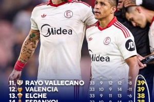24直播网4月27日讯 西甲第32轮比赛,塞维利亚在客场以1-2的比分不敌奥萨苏纳。本场比赛之后,塞维利亚位居西甲第18位,跌入降级区。