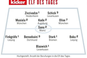 24直播网4月27日讯 德国媒体《踢球者》评出了德甲第31轮最佳阵容,奥利塞、穆西亚拉、希克在列。