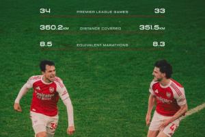 24直播网04月27日讯 阿森纳官方晒出一组数据图,阿森纳中场二人组苏维门迪和赖斯本赛季英超跑动距离相当于跑八次全马。