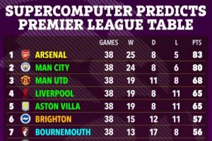 24直播网04月27日讯 英超争冠和保级都进入关键阶段,据太阳报报道,超级计算机预测了本赛季的英超大结局,阿森纳将以3分优势夺冠,而热刺将降级。