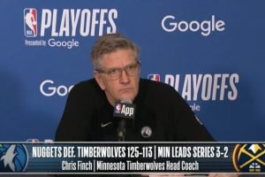 24直播网4月28日讯 NBA季后赛首轮,森林狼113-125不敌掘金,大比分3-2领先,森林狼主帅芬奇赛后接受了媒体采访,以下为完整版采访。