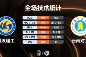 末节比赛,云南财大仍无法获得任何缩小分差的机会,分差反而被武汉理工扩大到五十分,比赛彻底失去悬念,最终武汉理工大胜云南财大成功晋级。
