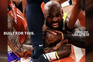 24直播网4月26日讯 今日,湖人官推晒出一张昨日在湖人击败火箭的季后赛首轮G3加时赛中,詹姆斯倒地奋力拼抢球权的海报。